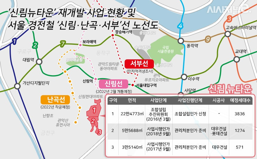관악구는 신림뉴타운을 중심으로 재개발 사업이 활발합니다. 신림3구역은 준공되었고, 신림1구역은 사업시행인가를 획득했으며, 신림2구역은 철거가 완료되었습니다. 봉천동에서도 재개발이 진행 중입니다.