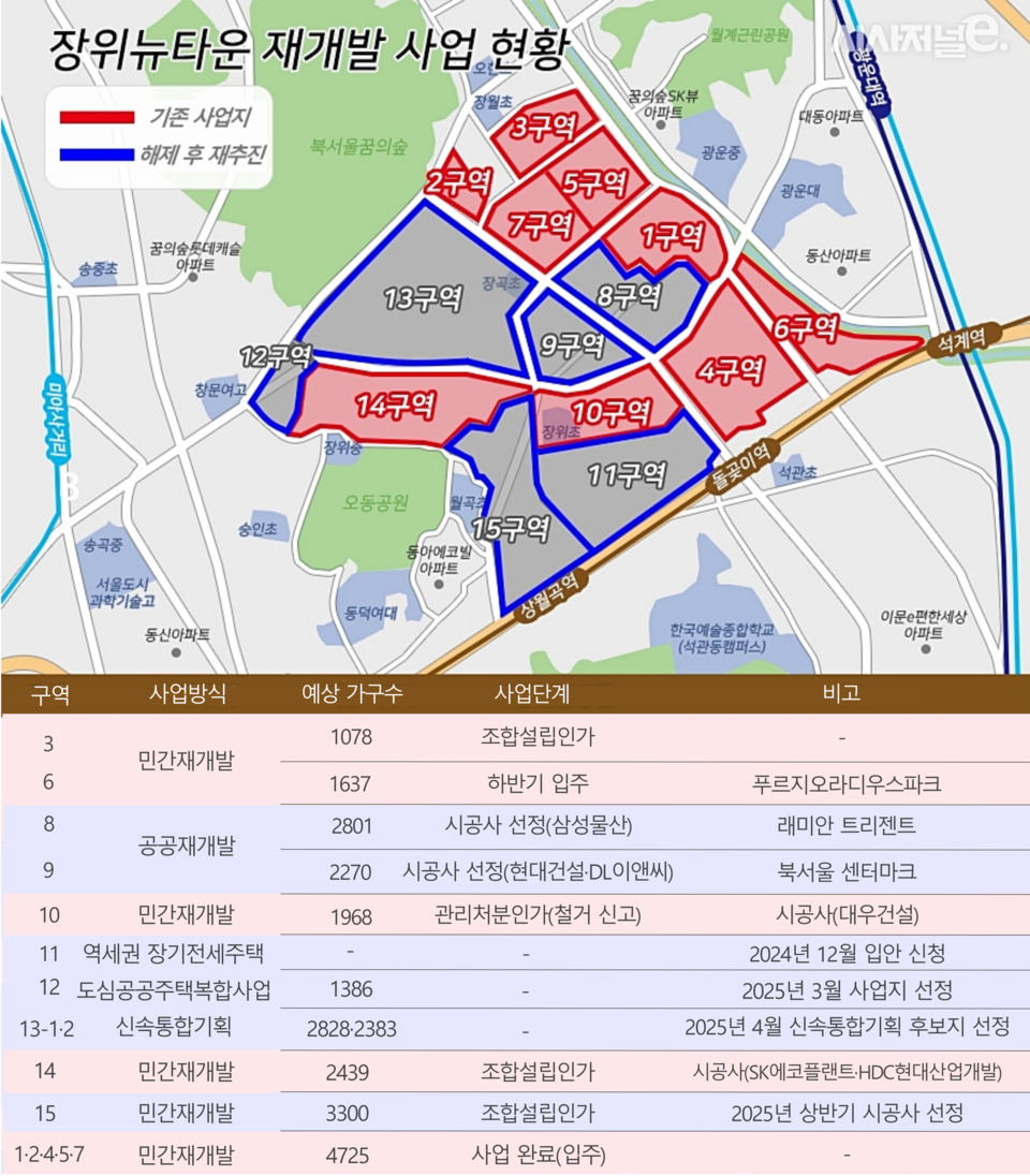 성북구에서는 길음뉴타운과 장위뉴타운을 중심으로 재개발 사업이 진행되고 있습니다. 장위뉴타운은 여러 구역으로 나뉘어 개발 중이며, 1, 2, 5, 7구역은 입주를 완료했고, 4, 6, 10구역은 공사 중이거나 착공 예정입니다. 8, 9, 11, 12, 13, 14, 15구역에서는 공공재개발 등 다양한 방식으로 사업이 추진되고 있습니다. 길음뉴타운은 다른 뉴타운에 비해 비교적 빠르게 개발이 완료되었으며, 길음5구역 등 일부 지역에서 재개발이 진행 중입니다. 성북1구역에서는 공공재개발이 추진되고 있습니다.