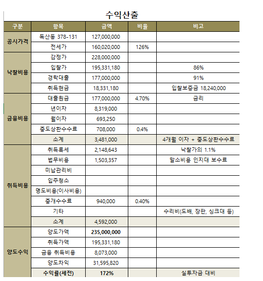 대출금리와 중도수수료 등 비용 산출과 선배님들에 비해서 크지는 않지만 수익률 산출해봤습니다^^