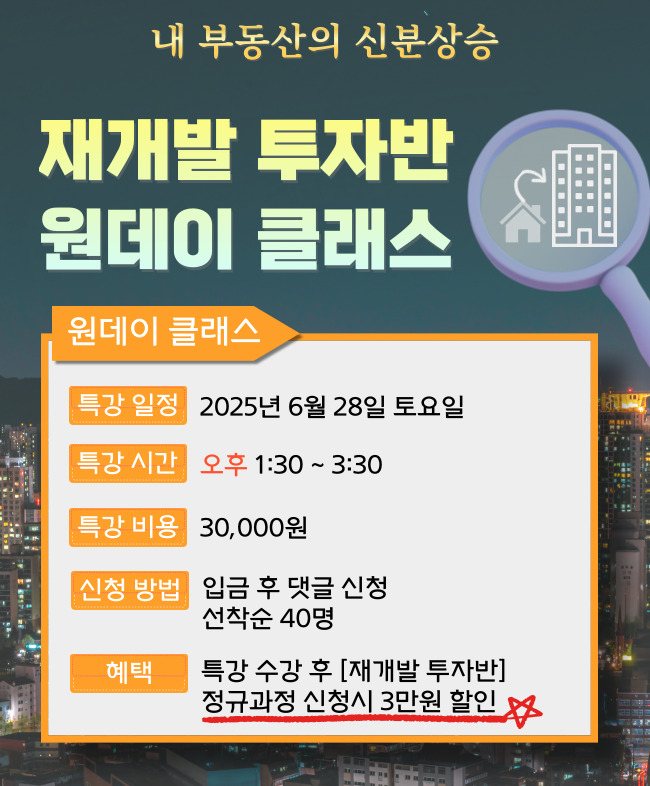 ▶ 특전 : 특강 신청 후 [재개발 투자반] 정규과정 신청시 특강료 30,000원 할인