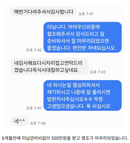 1월 17일에 미납관리비도 알아서 전부 납부해주시고 명도가 마무리되었습니다.