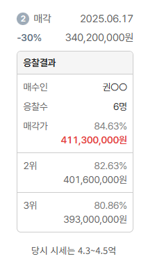 그래서 싸게 받는 것도 좋지만 앞으로 오르는 타이밍에 올라타는 게 더 중요하다고 생각해서 당시 시세인 4억3천~4억5천정도보다 약간만 저렴하게 낙찰을 받았습니다.