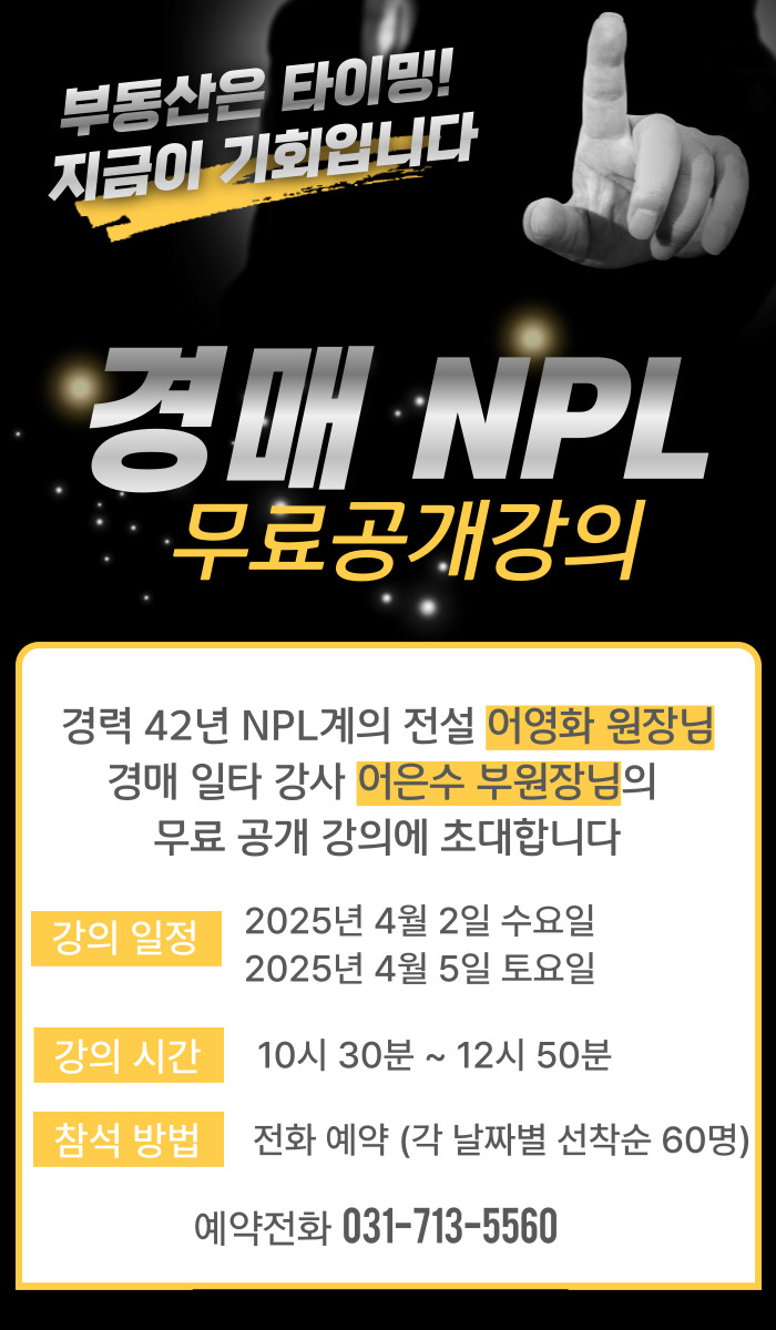 [2025년 4월 분당NPL경매학원 무료 공개 강의 안내] 경매 및 NPL 강의 _ 어영화 원장님 / 어은수 부원장님