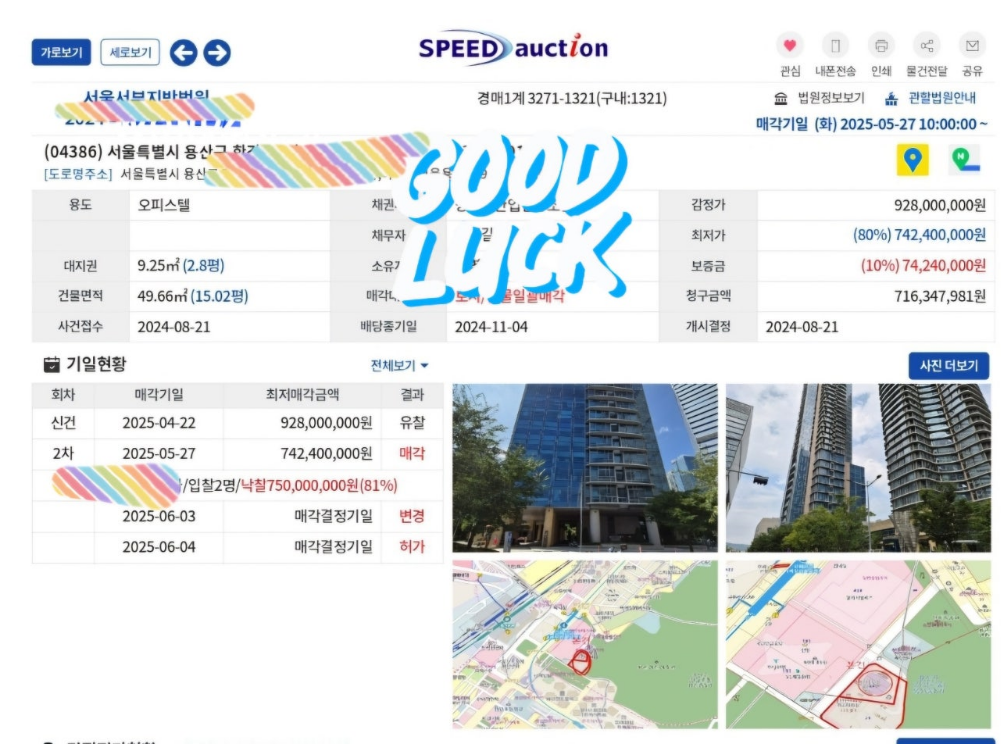 작년 11월 계약을 했던 용산 물건이 2차기일에 제3자의 낙찰로 예상했던 수익률을 달성할 수 있을 것 같습니다.