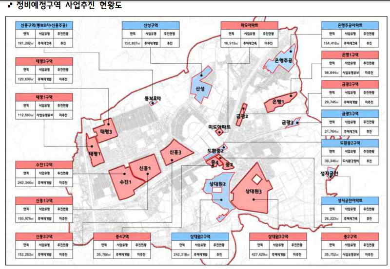 서울시 주요 재개발 지역의 현황 자료입니다.