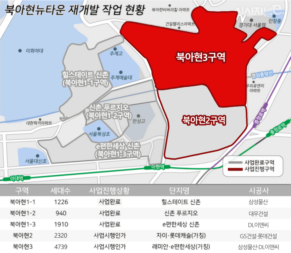 서대문구는 북아현뉴타운과 가재울 재정비촉진지구를 중심으로 재개발 사업이 활발합니다. 북아현뉴타운은 1-1, 1-2, 1-3구역이 완공되었고, 2, 3구역에서는 사업 진행에 어려움을 겪고 있습니다. 가재울 재정비촉진지구는 대규모 사업으로 1~6구역은 완료되었고, 7, 9구역에서 사업이 진행 중입니다. 홍은1구역에서는 공공재개발이 추진되고 있습니다.