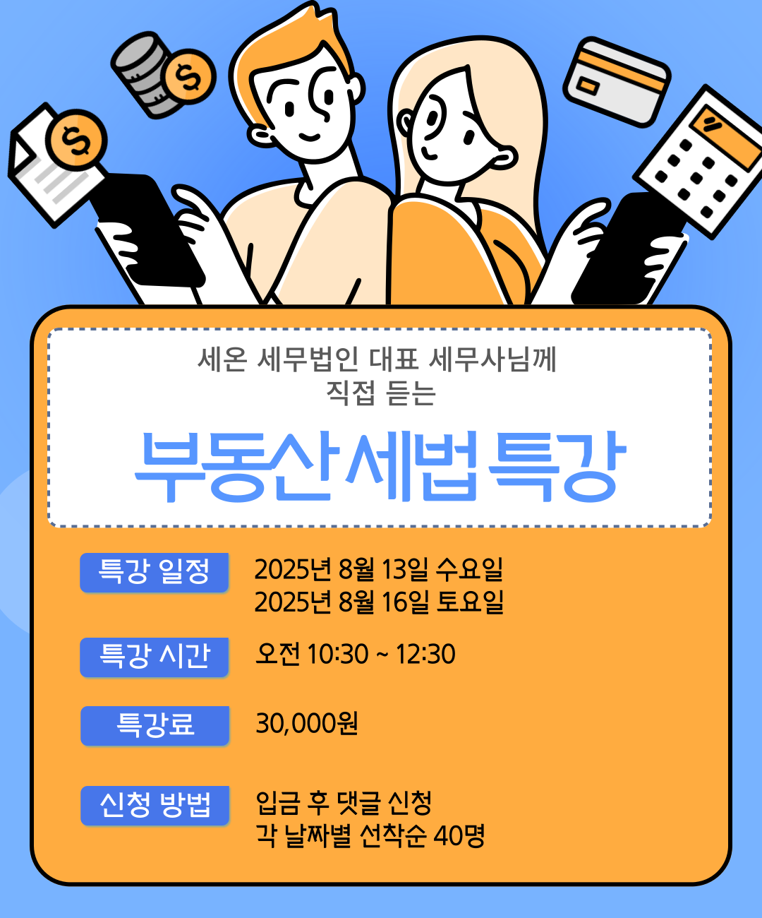 1년에 딱!!! 한번만 진행하는 [ 부동산 세법 원데이 클래스 ] 상속세, 증여세, 과세표준 변경 등 부동산 관련 세법 배우러 오세요~! ▶ 특강 일정 : 2025년 8월 ...